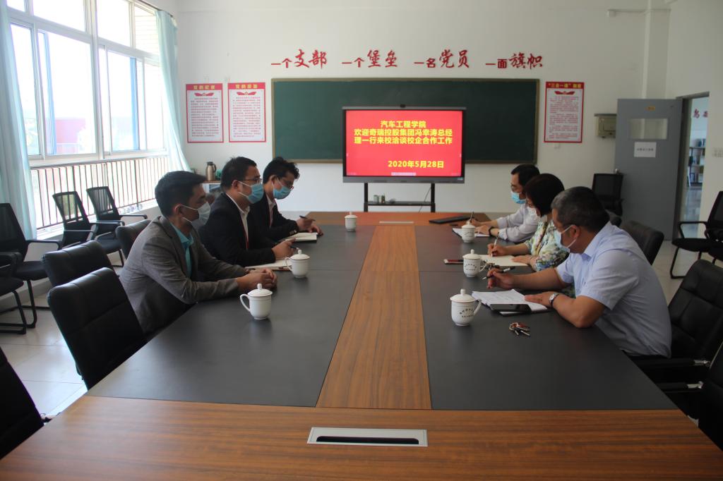 528日,奇瑞控股集团校企合作部总经理冯辛涛一行3人到Bevictor伟德官网洽谈校企合作工作。Bevictor伟德官网经理杜洪香、副经理张勇及产学合作办公室老师参加洽谈会。