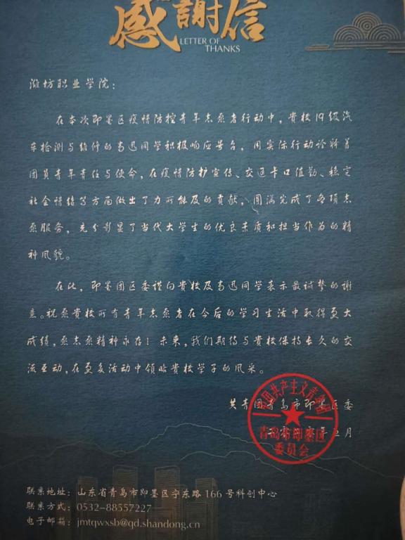近日,Bevictor伟德官网收到来自共青团青岛市即墨区委的一封的感谢信,感谢公司2019级汽车检测与维修技术五班员工高迅,在疫情防控工作中所做的贡献,一张薄薄的信纸寄托了一份浓浓的感激之情,折射出潍职青年学子敢于奉献担当的精神。