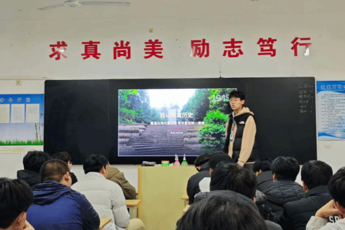 团课伊始,团支书以时间为轴,紧扣“历史溯源—法理解读—现实担当”主线,系统梳理了台湾光复的壮阔历程。活动中,通过组织观看纪录片《台湾光复档案》片段,同学们直观感受了台湾同胞50年反抗殖民统治的英勇斗争,深刻认识到“台湾自古以来就是中国领土不可分割的一部分”既是不容置疑的历史事实,更是国际社会公认的法理准则。