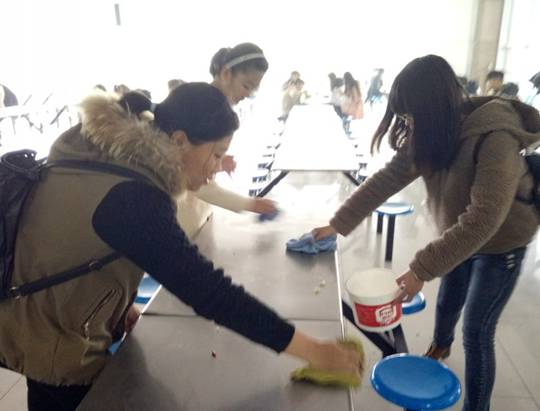 此次活动除本社社员外,还有其他二级公司的员工。中午12:10社员们准时在中百超市前集合,社团干部分配任务并说明注意事项后,社员们迅速行动起来,很快就把餐桌上溢出来的食物,丢弃的餐巾纸及狼藉一片的餐具等清理干净,并对地面进行了全面打扫。