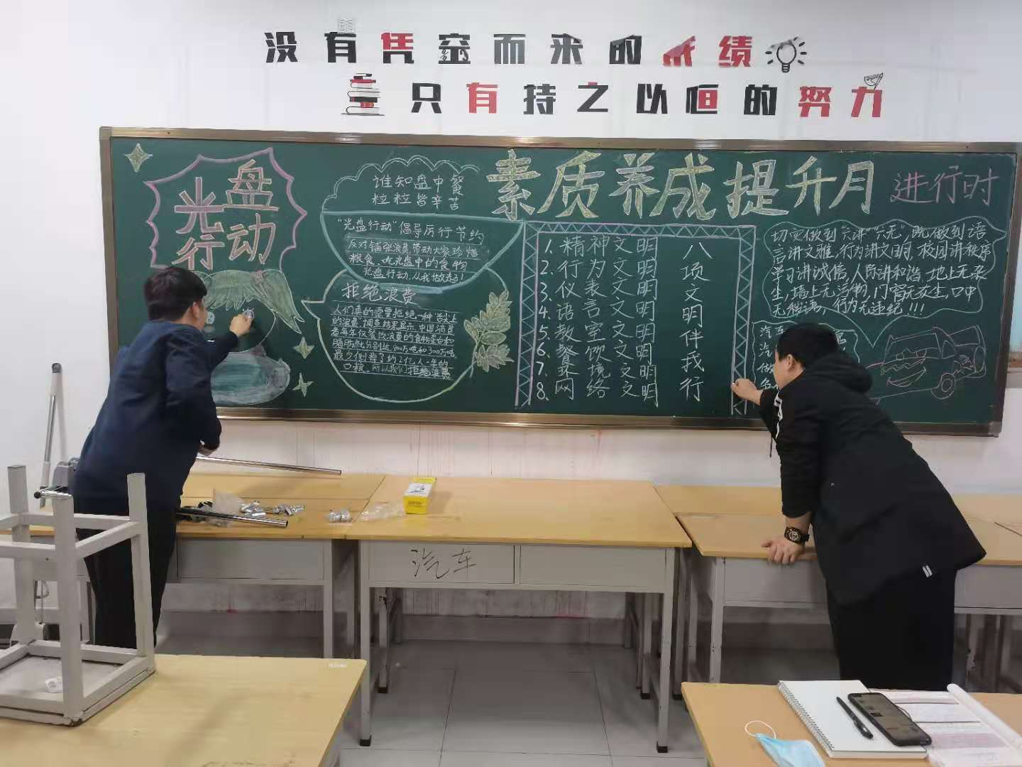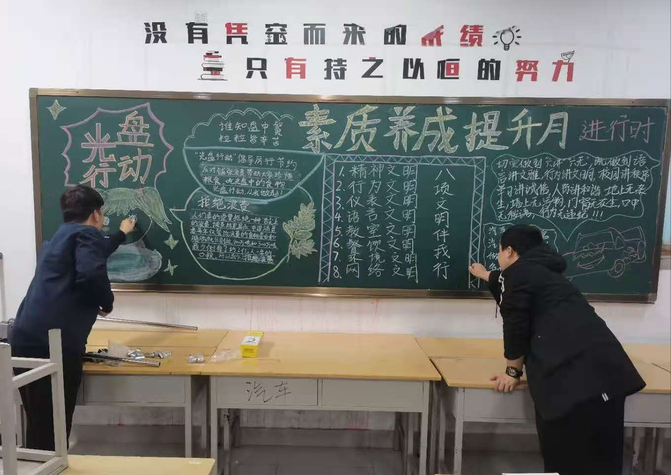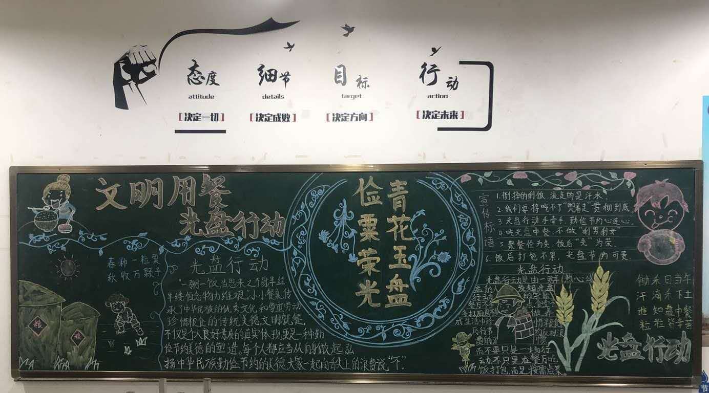 活动前,各班主任通过召开“文明用餐 光盘行动”主题班会并组织开办“光盘行动”主题黑板报的形式营造了文明就餐光盘行动氛围,做到员工人人知晓,共同争做文明餐桌的参与者。活动实施阶段,各班成立了文明就餐引导小组和光盘行动检查小组,监督教育同学就餐时自觉排队,保持良好的就餐秩序;按需取餐,节约粮食,提倡光盘行动;餐后主动将食物残渣及餐具送到收残台,减轻保洁工作人员工作量,提高了用餐高峰期餐桌使用效率。