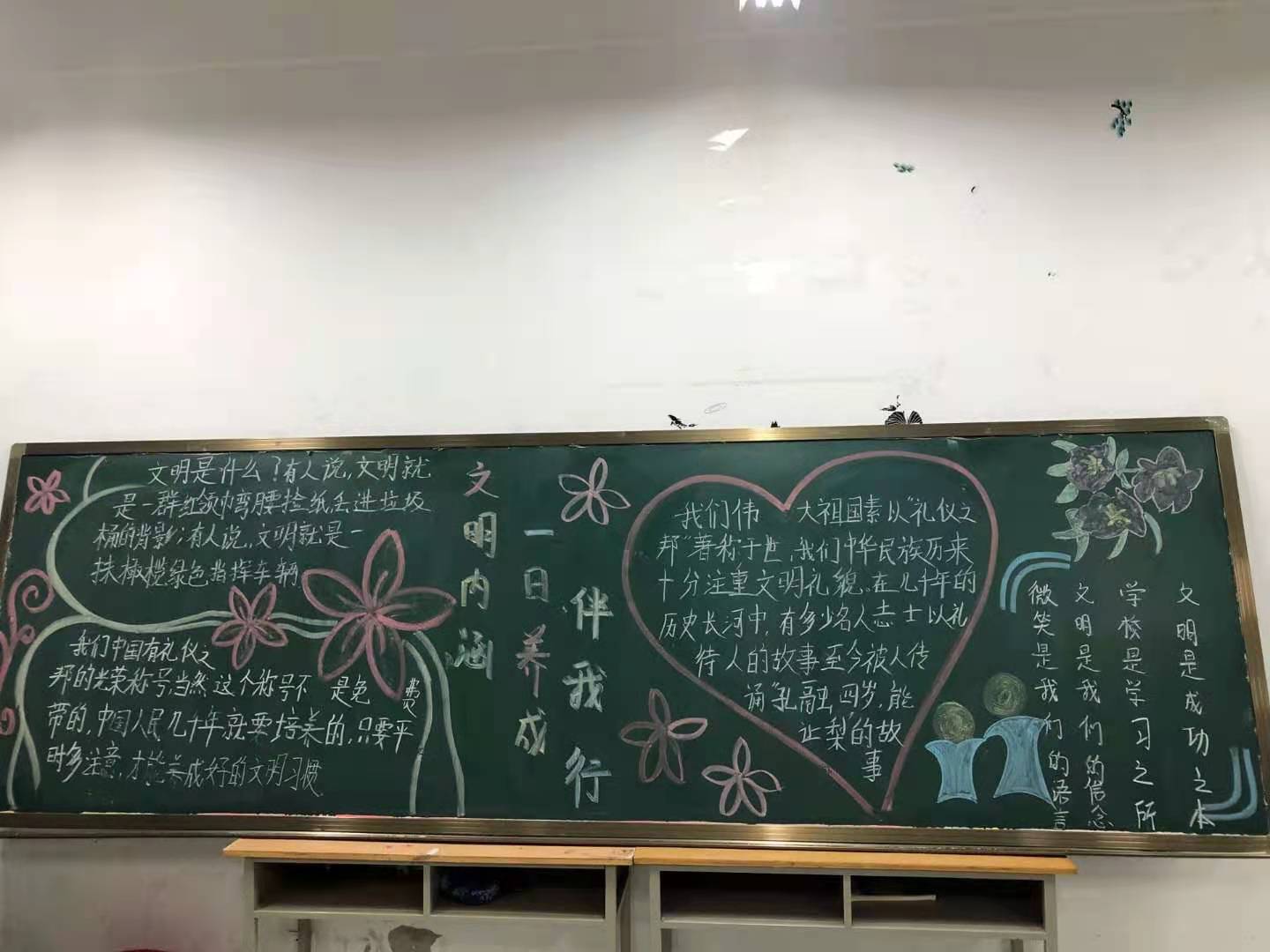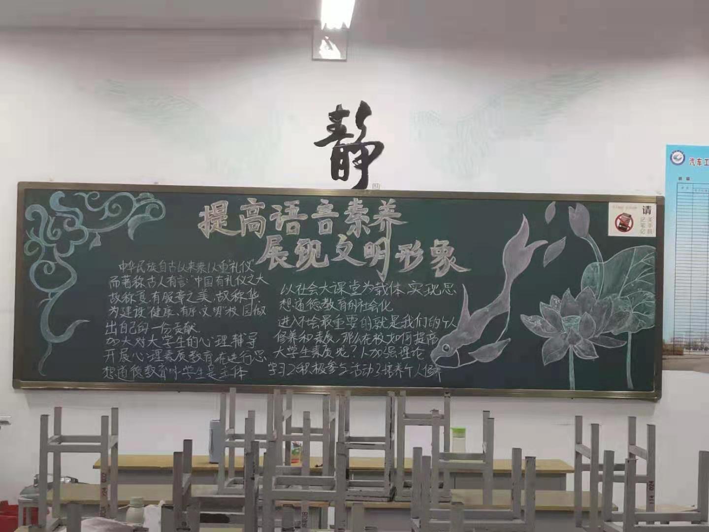 主题班会上,同学们积极发言,将自己的所想、所感充分地表达出来,展现了自己对文明内涵的深刻理解,使每个同学都意识到注重自身修养、重礼仪的人才能真正成为优秀的人。各班绘制的黑板报色彩鲜明、主题突出,视觉冲击力强,充分展现了汽车学子对文明内涵的理解。