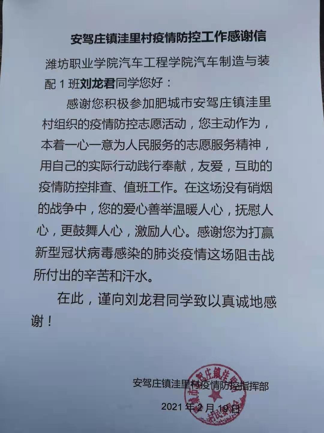 近日,Bevictor伟德官网收到肥城市安驾庄镇洼里村两委送来的感谢信,感谢公司2020级汽车制造与装配技术1班学子刘龙君在疫情防控工作中所做的贡献,一张薄薄的信纸寄托了一份浓浓的感激之情,折射出潍职青年学子敢于奉献担当的精神。