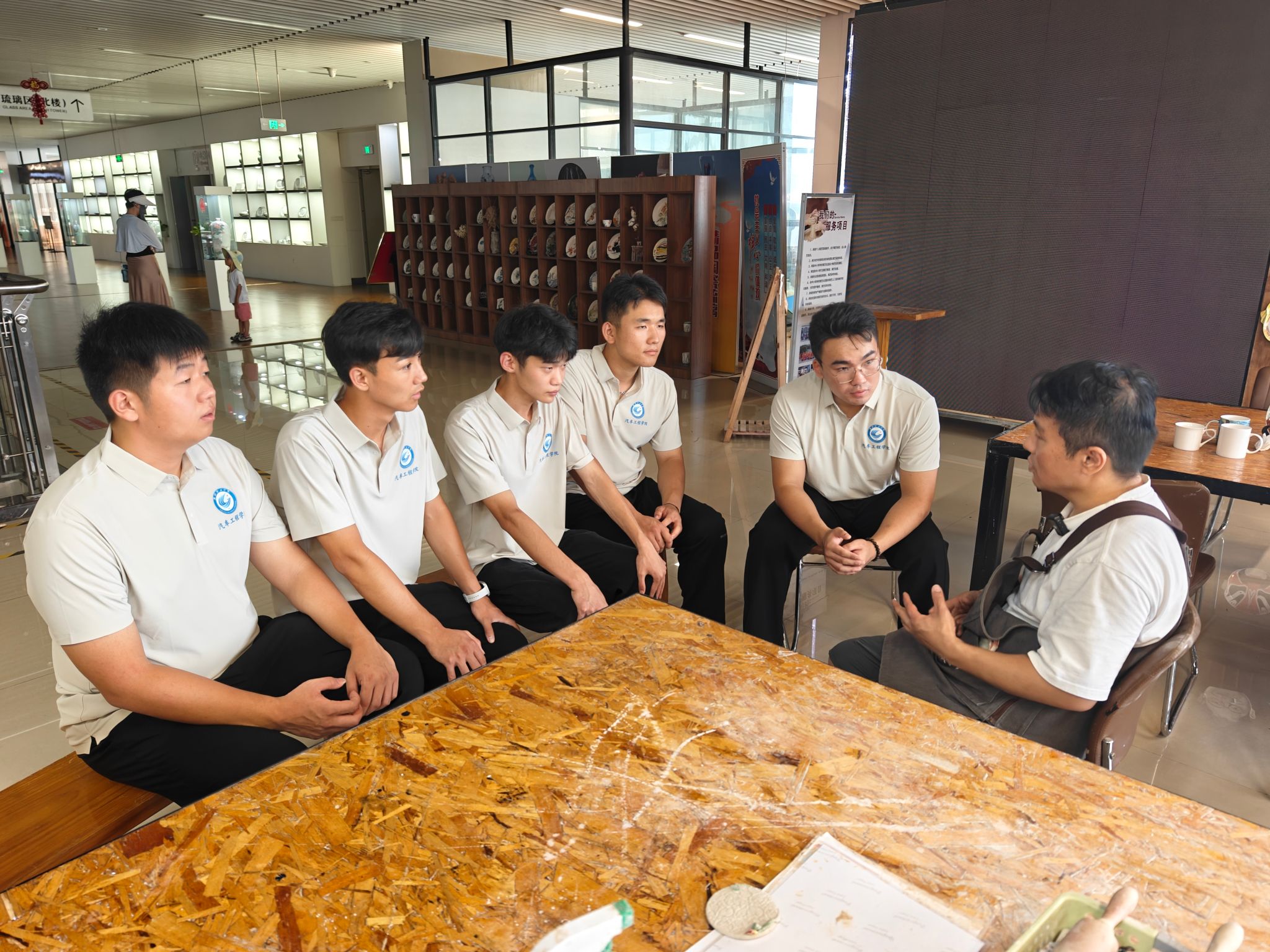 探寻琉璃秘境,传承千年匠心。在琉璃文化探寻之旅中,团队首站来到淄博陶瓷琉璃博物馆,馆内流光溢彩的琉璃展品让同学们惊叹不已,从古代宫廷贡品到现代艺术珍品,一件件作品展现着琉璃工艺的千年传承。随后,团队专访了非物质文化遗产传承人、淄博工匠任波,他向同学们讲述了琉璃制作的复杂工序,从原料配比到火候控制,每一步都凝聚着匠人的心血。“琉璃是火与土的艺术,更是耐心与坚守的结晶。” 他的话语让同学们深受触动。在动手实践环节,同学们在任波的指导下尝试制作简单的琉璃物件,当看到熔融的琉璃在自己手中逐渐成型时,大家切实体会到了非遗传承的艰辛与乐趣。