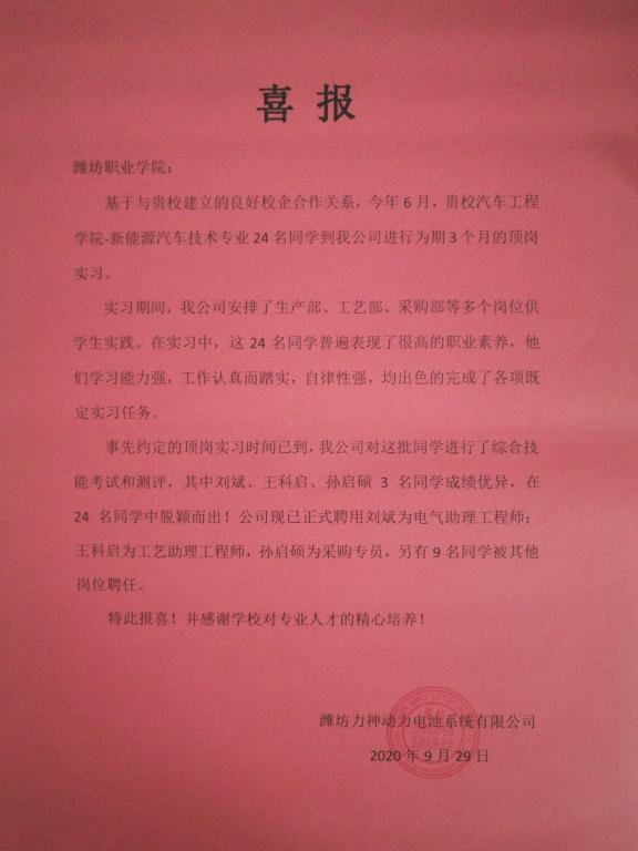9月29日上午,潍坊力神动力电池系统有限公司为公司送来喜报,感谢公司对专业人才的精心培养!