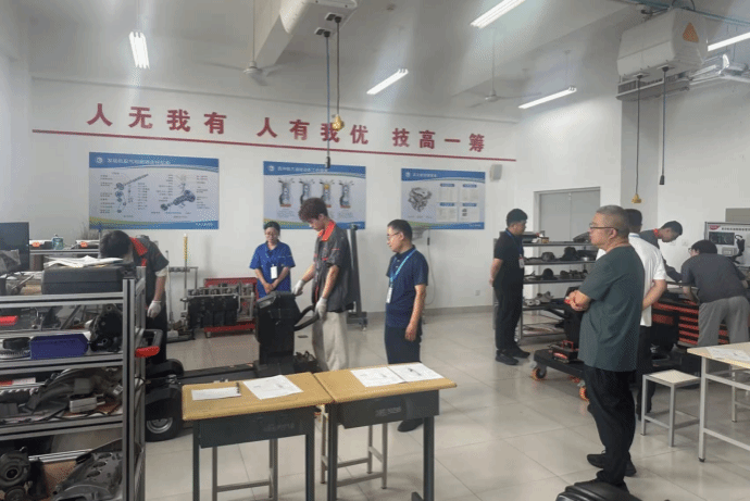 本次职业技能等级认定分为理论考核和实操考核两部分。理论考核采用上机考试形式,全面考查员工对汽车维修理论知识的掌握程度,涵盖职业道德、基础知识、发动机检修、底盘检修及汽车电器检修等内容,检验员工的专业知识储备能力。实操考核则紧密结合实际工作场景与员工就业岗位需要,设置整车常规保养及关键部件拆装、发动机曲轴活塞连杆组拆装检测、汽车电器故障诊断检修和新能源车故障检修等项目,重点考察汽车维修工具的使用、汽车零部件的拆检能力和电器故障诊断思维。